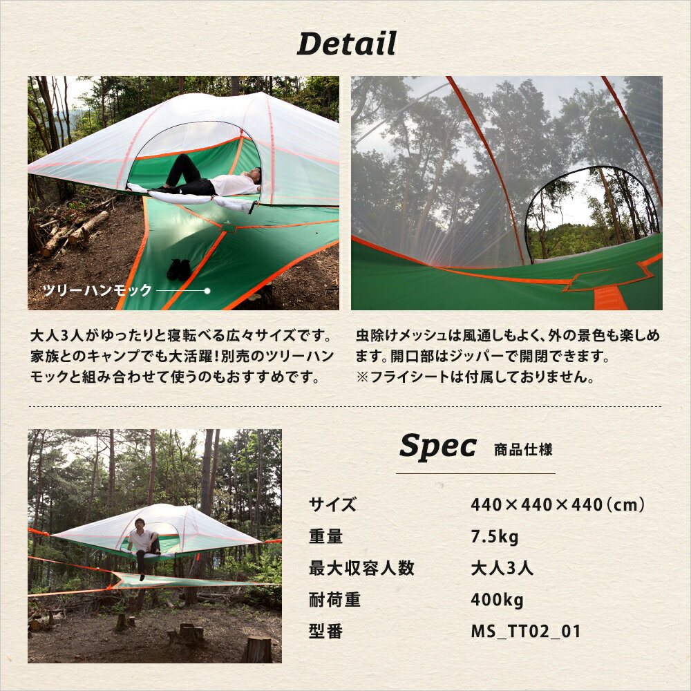 ツリーテントの下にこのツリーハンモック重ねて吊り下げれば、階層構造になったフロアスペースができあがります。