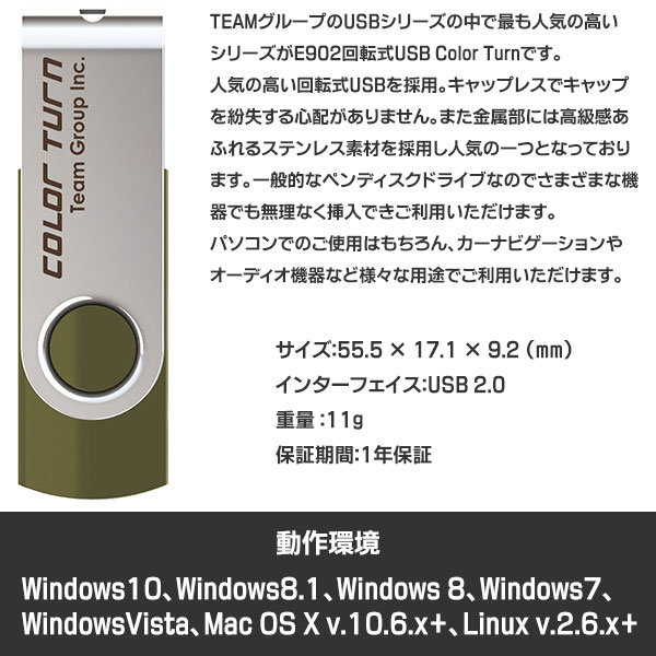 【全国送料無料(メール便発送)※代引き選択の場合は有料です。】チームジャパン USBメモリー16GB Color Turn E902 16GB Green USBメモリ USBフラッシュメモリ16GB/USB2.0 16GBグリーン