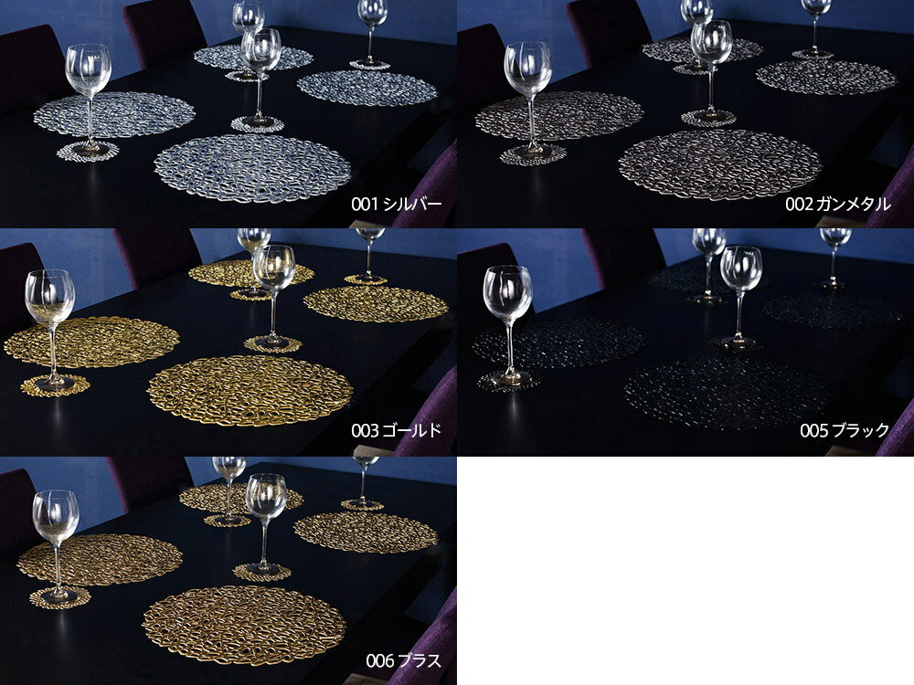 小石状のペブル模様 「ペブル」は小石や玉石を意味し、小石状の丸が集まって一つの円形を描いたデザインで、食卓のアクセントに単独で使っても、他のテーブルマットと組み合わせて使っても絵になる 「PEBBLE」。